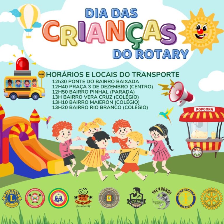 Neste sábado, 12 de outubro, o Rotary promove mais uma edição do Dia das Crianças, que acontecerá no Parque da Fejão. A programação especial terá início às 13h, oferecendo diversas atividades, como brincadeiras, brinquedos, dinâmicas, além do tradicional cachorro-quente e pipoca, garantindo muita alegria e diversão. Haverá transporte disponível nos bairros da cidade, com retorno programado para às 17h.