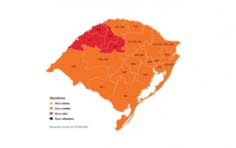 Com isso, apenas quatro regiões (Santo Ângelo, Cruz Alta, Ijuí e Santa Rosa) ficaram com bandeira vermelha (risco alto) – mesmo número registrado há 10 semanas, quando o Estado ainda era dividido em 20 regiões Covid. Desde 7 de julho, são consideradas 21 regiões.