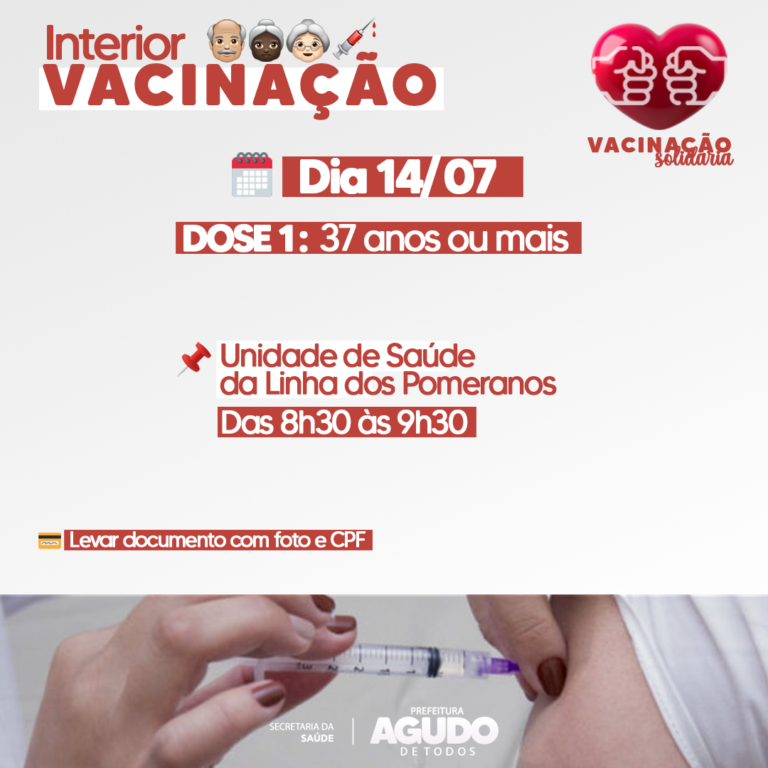 A Secretaria da Saúde de Agudo vai levar a vacinação contra a Covid-19 para as comunidades do interior. De acordo com a secretária Verônica Scardoelli, será aplicada a primeira dose do imunizante em pessoas com 37 anos ou mais, e integrantes dos grupos prioritários. Nesta quarta-feira (14), a vacinação será no Posto de Saúde da Linha dos Pomeranos, das 8h30 às 9h30.