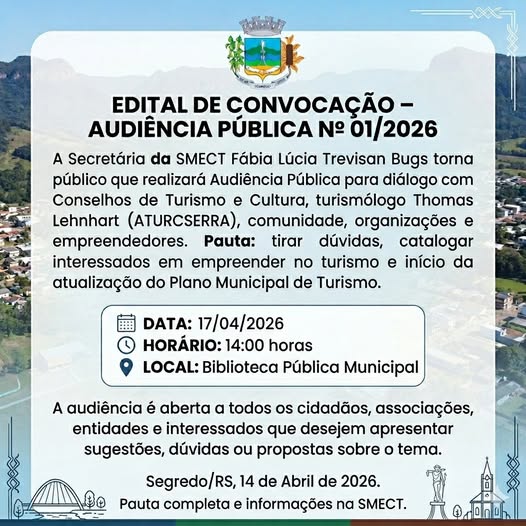 De acordo com a secretária, Fábia Lúcia Trevisan Bugs, a iniciativa tem como objetivo promover o diálogo entre o poder público, conselhos municipais, empreendedores e a população em geral. A audiência contará com a presença do turismólogo Thomas Lehnhart, representante da ATURCERRA, além de integrantes dos Conselhos de Turismo e Cultura.