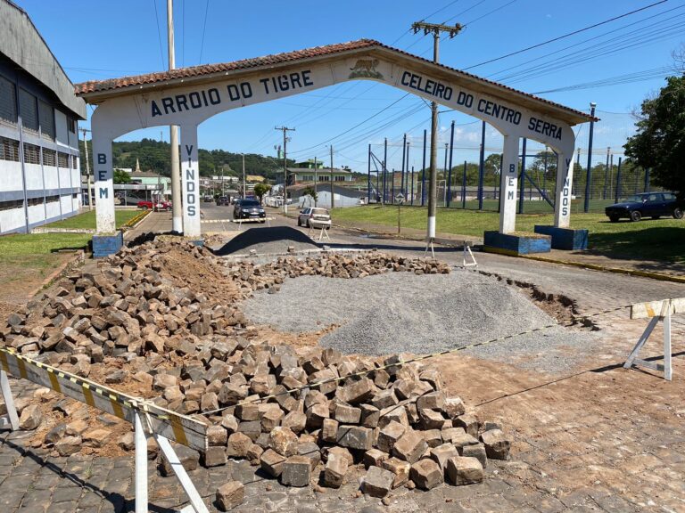 A Secretaria de Obras e Serviços Urbanos de Arroio do Tigre está fazendo a melhoria do calçamento, na entrada da cidade, junto ao pórtico. Ali havia muitas ondulações e foi necessária a correção do pavimento.