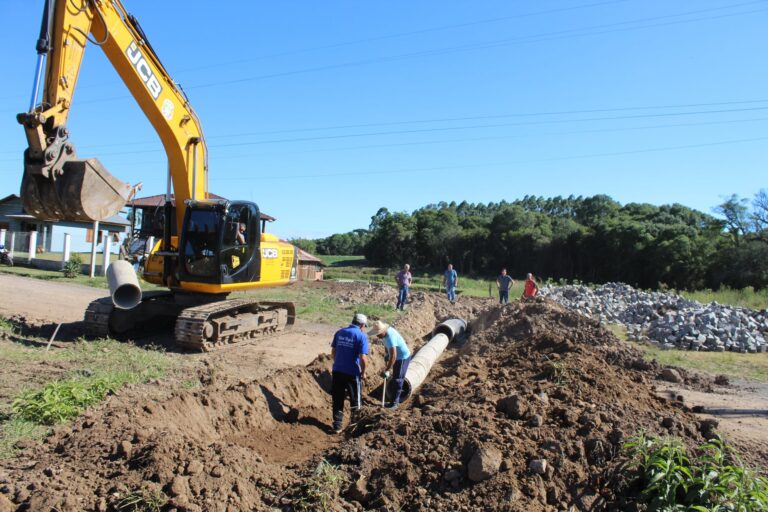 O prefeito de Lagoa Bonita do Sul, Luiz Francisco Fagundes, juntamente com os secretários municipais da Agricultura e Meio Ambiente, Paulo Cerentini, e de Obras e Serviços Públicos, Antônio Possebon, estiveram acompanhando as obras de canalização pluvial da Rua Pedro de Moraes.