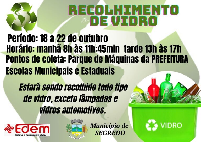 Haverá pontos de coleta no parque de máquinas da prefeitura e nas escolas municipais e estaduais de Segredo. Conforme o prefeito Valdir Rodrigues será recolhido qualquer tipo de vidro, com exceção de lâmpadas e vidros automotivos.