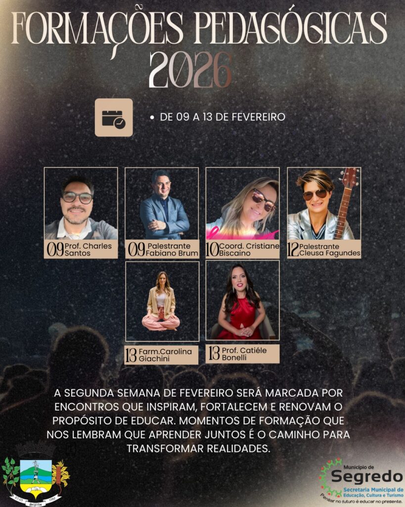A Secretaria Municipal de Educação promove, entre os dias 9 e 13 de fevereiro, a programação das Formações Pedagógicas 2026, reunindo professores, coordenadores e profissionais da educação para uma semana dedicada ao aperfeiçoamento, à troca de experiências e ao fortalecimento das práticas pedagógicas na rede municipal. A iniciativa contará com a participação de convidados que trarão reflexões sobre educação, motivação, bem-estar e metodologias aplicadas em sala de aula.