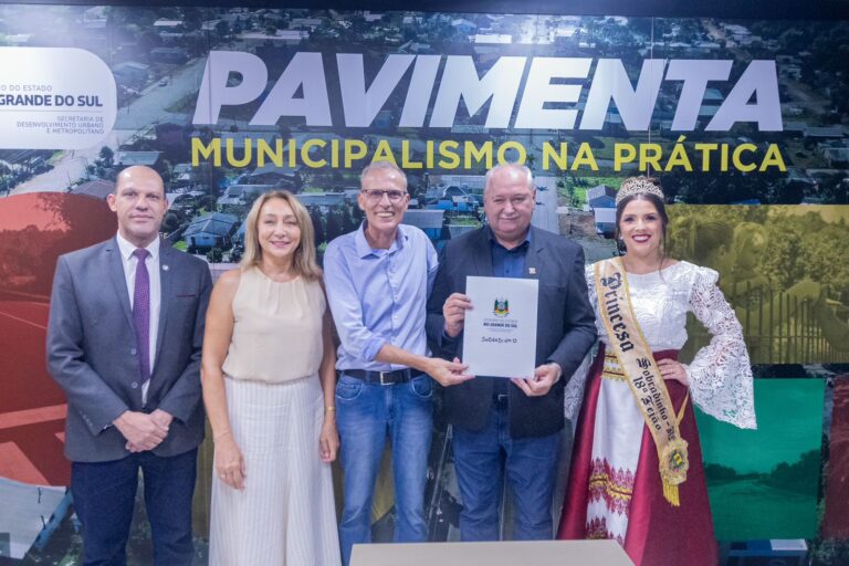 O prefeito de Sobradinho, Armando Mayerhofer, participou, nessa quarta-feira (13), do anúncio dos municípios contemplados pelo programa Pavimenta 2. O evento ocorreu no Salão Negrinho do Pastoreio, no Palácio Piratini, e contou com a presença do governador Eduardo Leite, do vice-governador Gabriel de Souza, do secretário de Desenvolvimento Urbano e Metropolitano, Carlos Rafael Mallmann, prefeitos e representantes dos 237 municípios gaúchos que vão receber R$ 251,3 milhões do Pavimenta 2; recursos do programa para 2024, em uma nova fase de investimentos na infraestrutura rodoviária dos municípios do Estado. Lançado em 2021, o Pavimenta tem como objetivo o aumento e a qualificação da infraestrutura rodoviária das cidades gaúchas, por meio de parceria entre Estado e municípios, para implementação de obras de pavimentação.
