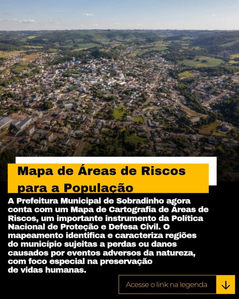A Administração Municipal de Sobradinho conta agora com um Mapa de Cartografia de Áreas de Risco, um importante instrumento da Política Nacional de Proteção e Defesa Civil. Segundo o coordenador da Defesa Civil, José Carlos Spanevello, o mapeamento identifica e caracteriza regiões do município sujeitas a perdas ou danos causados por eventos adversos da natureza, com foco especial na preservação de vidas humanas.