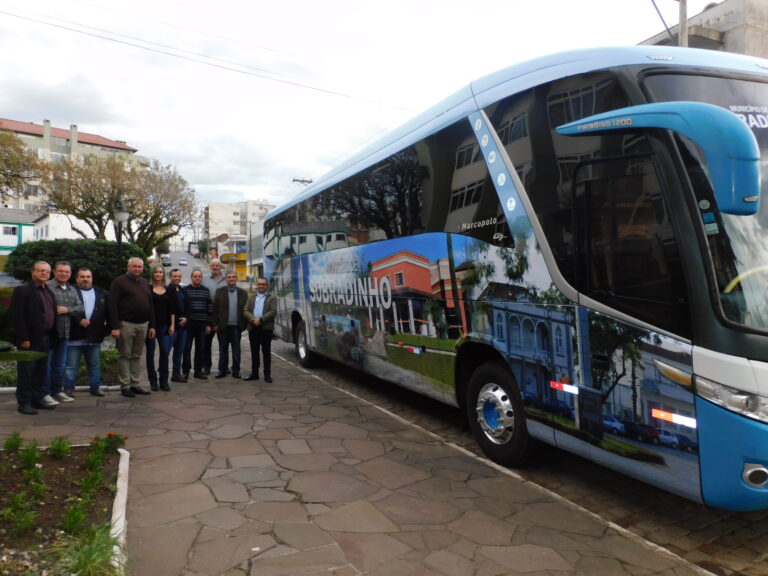 O ônibus adquirido recentemente pela Administração Municipal de Sobradinho foi totalmente personalizado com fotos dos pontos turísticos e também com as soberanas e feijoaninha do município.