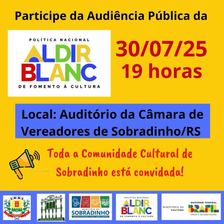 O município de Sobradinho promove Audiência Pública para elaboração do plano de aplicação de recursos da Política Nacional Aldir Blanc- PNAB 2025. Será nesta quarta-feira (30), às 19 horas, no auditório da Câmara de Vereadores. Com o objetivo de fomentar a cultura local através dos recursos federais da PNAB, essa escuta pública da comunidade é necessária para a elaboração do edital, que deverá ser lançado em setembro e contemplar projetos culturais do município.