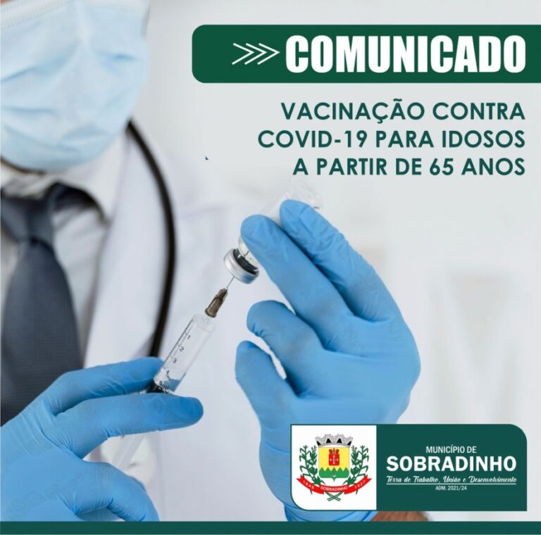 A Secretaria Municipal da Saúde de Sobradinho solicita a partir desta segunda-feira (05) aos idosos com idade a partir de 65 anos que entrem em contato com ESF de sua referência para agendar o dia para receber a vacina contra Covid-19. O agendamento deve ser feito pelos telefones: ESF Bairro Vera Cruz –3742-2151; ESF Bairro Baixada – 3742-3399 ou 9-8041-0189; ESF Bairro Rio Branco – 3742-3576; ESF Bairro Copetti – 3742-2611 ou 9- 9756-3972 e no Posto de Saúde Central –3742-3470.