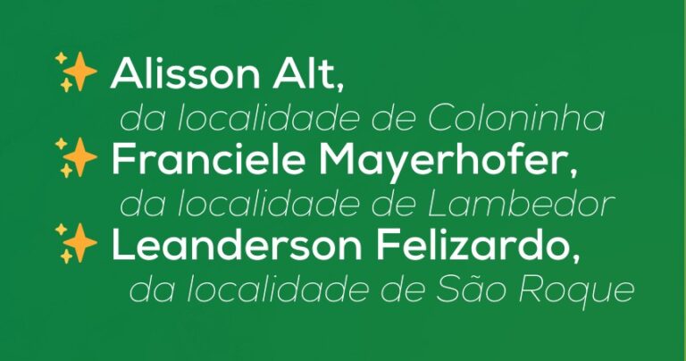 O município de Arroio do Tigre teve três jovens agricultores contemplados com recursos do Programa Agrofamília – Jovens, financiado pelo FEAPER. Foram beneficiados Alisson Alt (Coloninha), Franciele Mayerhofer (Lambedor) e Leanderson Felizardo (São Roque). Em 2025, outros 15 jovens do município já haviam sido contemplados, fortalecendo a sucessão e a permanência na agricultura familiar.