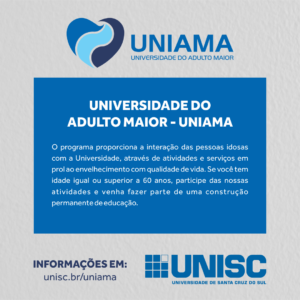 A Unisc está com inscrições abertas para o Programa Universidade do Adulto Maior (Uniama), voltado a pessoas com idade igual ou superior a 60 anos. Vinculado ao Núcleo de Ação Comunitária (NAC), órgão da Direção de Extensão e Relações Comunitárias, o Uniama tem como objetivo proporcionar a interação das pessoas idosas com a Universidade, através de atividades e serviços em prol ao envelhecimento com qualidade de vida.
