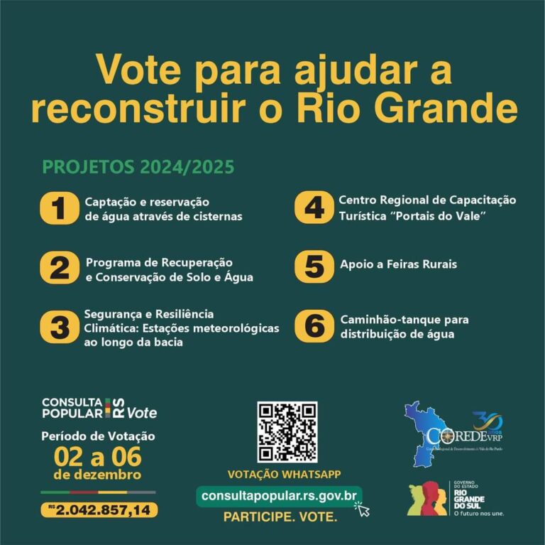 Está se aproximando o momento da comunidade regional do Vale do Rio Pardo decidir onde aplicar os R$ 2.042.857,14 destinados para o próximo ano, através da Consulta Popular. São seis opções na cédula, sendo possível optar por uma delas, somente. A participação é fundamental para que se possa atingir o número mínimo de 2% do eleitorado, em cada município, para alcançar o recurso. Para votar é simples, basta os participantes acessar www.consultapopular.rs.gov.br, inserir o número do título de eleitor e selecionar o projeto desejado. A votação ocorre na próxima semana, entre os dias 2 a 6 de dezembro.